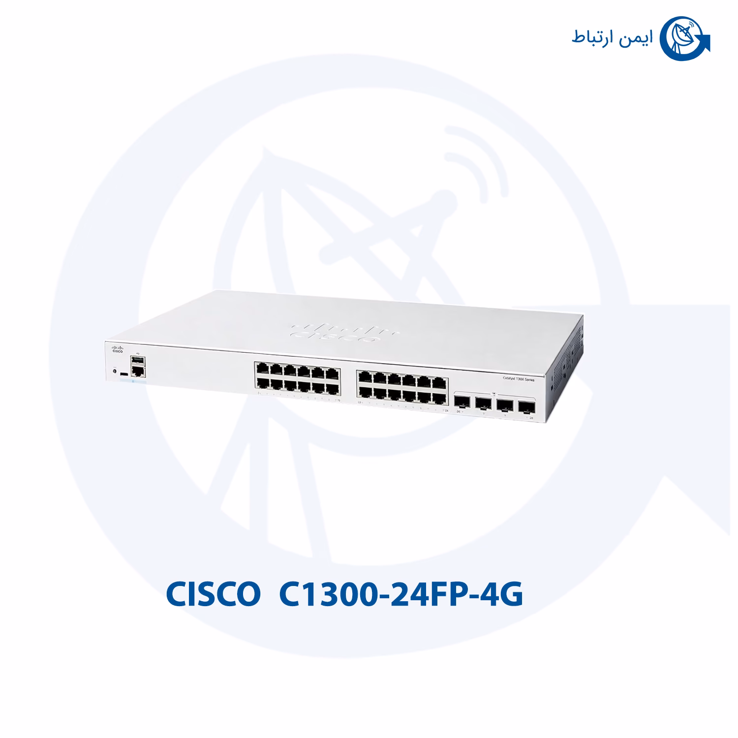 در این تصویر سوئیچ شبکه سیسکو مدل C1300-24FP-4G که دارای 24 پورت با قابلیت POE+ است را مشاهده می کنید.