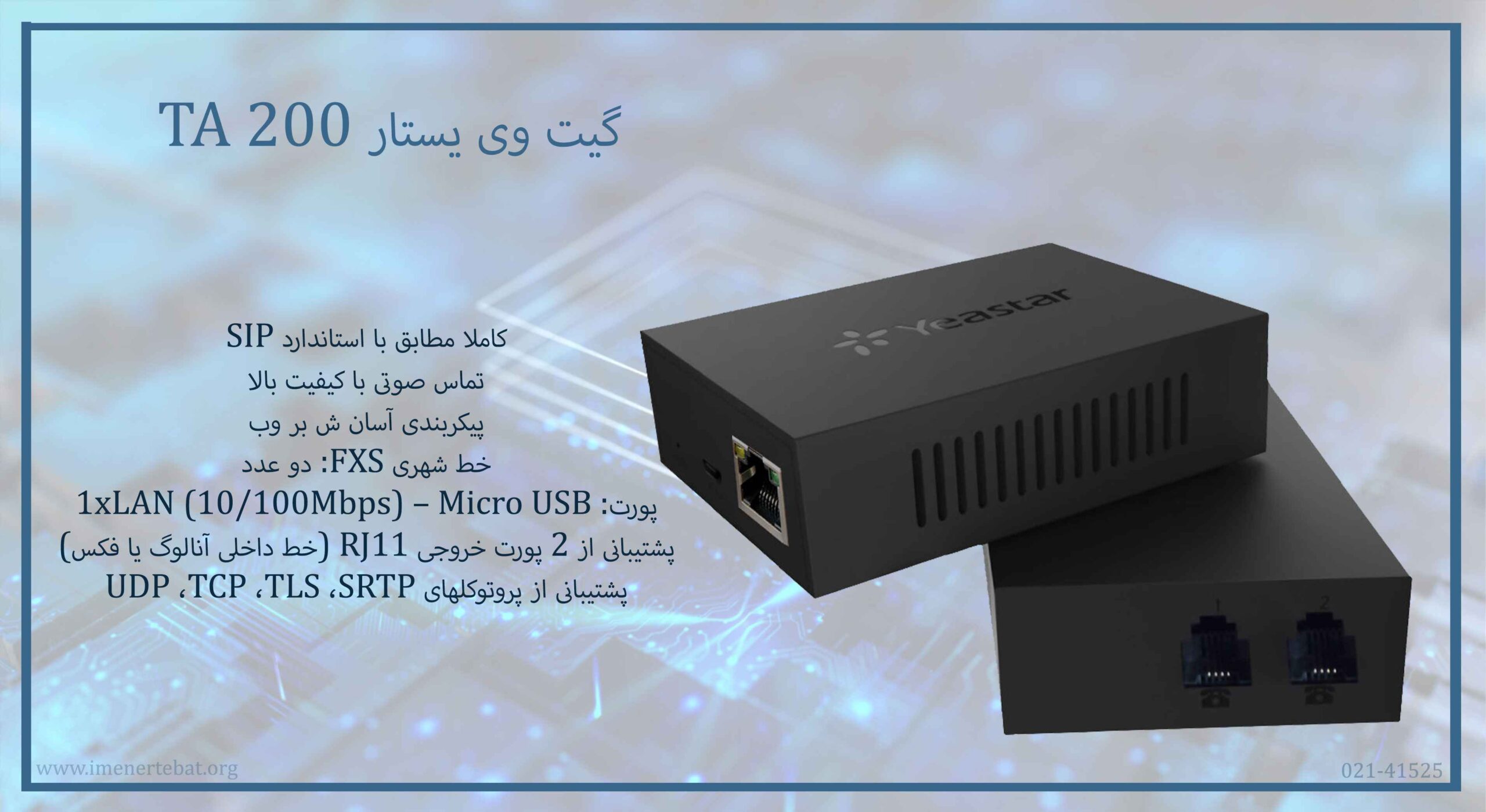 این محصول دارای دو پورت FXS برای اتصال تلفن آنالوگ به سیستم تلفن VoIP است. این محصول در وزن 2.45 کیلوگرم تولید شده و برای تجهیزات شبکه در بازار به فروش می رسد. دارای قابلیت پشتیبانی از پروتکل T.30، پروفایل SIP و micro USB می باشد. با توجه به پیاده سازی شبکه های کامپیوتری مبتنی بر TCP/IP، امکان استفاده از مبدل های تلفن آنالوگ یستار با ظرفیت یک یا دو پورت RJ11 نسبت به مقیاس خانگی در مشاغل کوچک وجود دارد. این مبدل ها بهترین راه برای اتصال سریع گوشی های آنالوگ در بستر VIP با کمترین هزینه خواهند بود. در ادامه مطلب، در نظر گرفتیم به معرفی برخی از ویژگی های گیت وی یستار TA 200 بپردازیم، همچنین شما عزیزان میتوانید جهت تهیه این محصول و خرید اکسس پوینت به فروشگاه آنلاین ایمن ارتباط مراجعه نمایید.