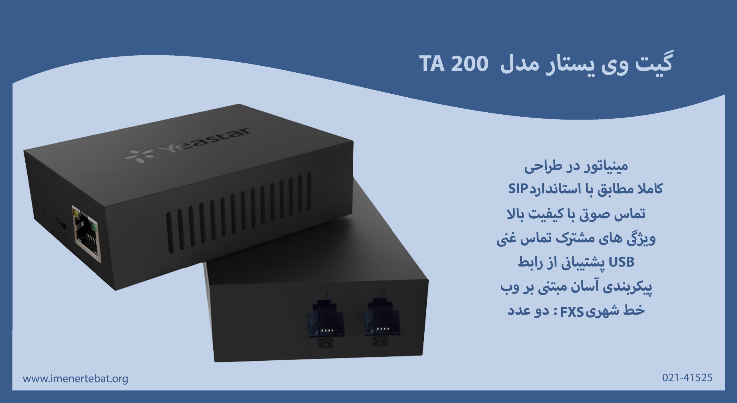 گیت وی TA 200 نسل بعدی 1 یا 2 پورت آداپتور تلفن آنالوگ است و تجهیزات آنالوگ را به طور مقرون به صرفه به شبکه های مبتنی بر IP تبدیل می کند. کمپانی Yeastar در توسعه و ساخت IP-PBX و VoIP تخصص دارد و متعهد به توزیع محصولات فناوری نسل جدید در زمینه ارتباطات سازمانی است. در همین حال، محصولات یستار به هتل ها کمک میکند تا سیستم تلفنی مقرون بهصرفه با ویژگی های خاص هتل، پیکربندی آسان مبتنی بر وب و قابلیت اطمینان کامل ایجاد کنند. گیت وی TA 200 قابلیت پشتیبانی از DTMF های RFC2833 ،SIP Info ،In-band را دارد. این برند به کمک تیم حرفه ای که دارد در تولید و طراحی محصولات خود بسیار موفق بوده است. از مهم ترین دستاورد های این برند تولید محصولاتی متناسب با نیاز های گوناگون کاربران می باشد.