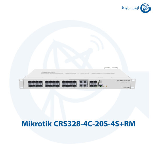 در این تصویر سوئیچ میکروتیک مدل CRS328-4C-20S-4S+RM که دارای 20 پورت SFP با سرعت 1 گیگابیت، 4 پورت SFP+ با سرعت 10 گیگابیت و 4 پورت Combo است را مشاهده می کنید.